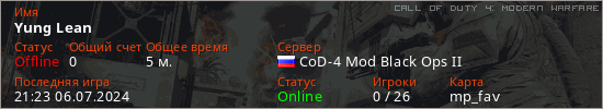 Играет на Call of Duty 4: Modern Warfare сервере. Страна: РоссияПервый раз замечен 20:57 06.07.2024