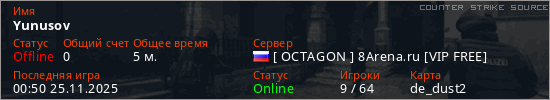 Играет на Counter Strike Source сервере. Страна: РоссияПервый раз замечен 00:46 25.11.2025
