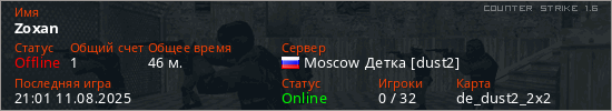 Играет на Counter Strike 1.6 сервере. Страна: РоссияПервый раз замечен 19:41 28.12.2023