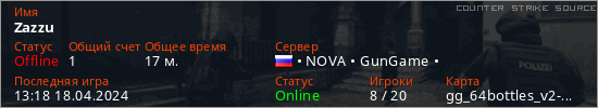 Играет на Counter Strike Source сервере. Страна: РоссияПервый раз замечен 14:32 06.04.2024
