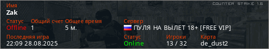 Играет на Counter Strike 1.6 сервере. Страна: РоссияПервый раз замечен 22:05 28.08.2025