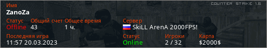 Играет на Counter Strike 1.6 сервере. Страна: РоссияПервый раз замечен 16:41 19.03.2023