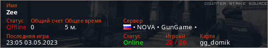 Играет на Counter Strike Source сервере. Страна: РоссияПервый раз замечен 23:03 03.05.2023