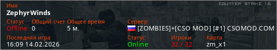 Играет на Counter Strike 1.6 сервере. Страна: РоссияПервый раз замечен 15:55 14.02.2026