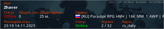 Играет на Counter Strike Global Offensive сервере. Страна: РоссияПервый раз замечен 12:07 08.11.2025