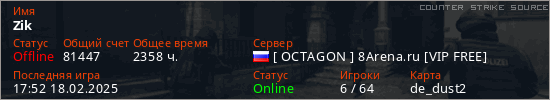 Играет на Counter Strike Source сервере. Страна: РоссияПервый раз замечен 16:03 02.09.2021
