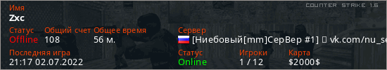 Играет на Counter Strike 1.6 сервере. Страна: РоссияПервый раз замечен 12:23 22.12.2021