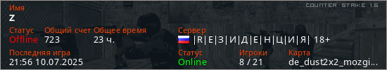 Последний раз был в сети 21:56 10.07.2025 Игрок с таким ником замечен на 50 серверах