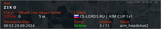 Играет на Counter Strike 1.6 сервере. Страна: РоссияПервый раз замечен 09:51 29.09.2024