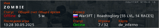 Играет на Counter Strike 1.6 сервере. Страна: РоссияПервый раз замечен 13:24 30.05.2025