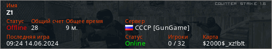 Играет на Counter Strike 1.6 сервере. Страна: РоссияПервый раз замечен 08:40 29.01.2024