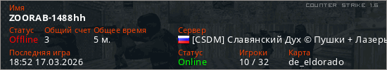 Играет на Counter Strike 1.6 сервере. Страна: РоссияПервый раз замечен 18:48 17.03.2026