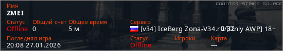 Играет на Counter Strike Source сервере. Страна: РоссияПервый раз замечен 19:46 27.01.2026