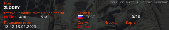 Играет на Call of Duty 4: Modern Warfare сервере. Страна: РоссияПервый раз замечен 18:40 13.01.2025