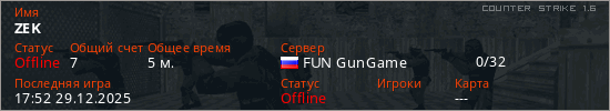 Играет на Counter Strike 1.6 сервере. Страна: РоссияПервый раз замечен 17:46 29.12.2025