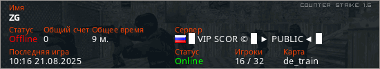 Играет на Counter Strike 1.6 сервере. Страна: РоссияПервый раз замечен 08:43 19.08.2025