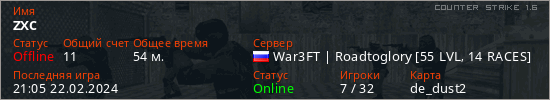 Играет на Counter Strike 1.6 сервере. Страна: РоссияПервый раз замечен 12:42 22.07.2022