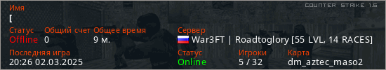 Последний раз был в сети 20:26 02.03.2025 Игрок с таким ником замечен на 26 серверах