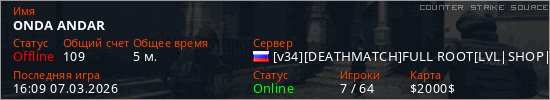Играет на Counter Strike Source сервере. Страна: РоссияПервый раз замечен 15:58 07.03.2026