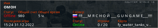 Играет на Counter Strike 1.6 сервере. Страна: РоссияПервый раз замечен 19:57 09.12.2022