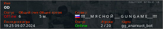 Играет на Counter Strike 1.6 сервере. Страна: РоссияПервый раз замечен 19:09 09.07.2024