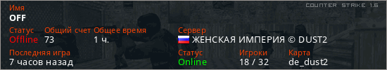 Играет на Counter Strike 1.6 сервере. Страна: РоссияПервый раз замечен 19:27 15.04.2023