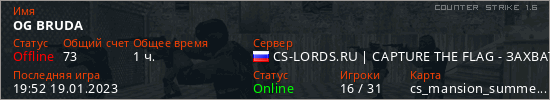 Играет на Counter Strike 1.6 сервере. Страна: РоссияПервый раз замечен 00:44 14.01.2023