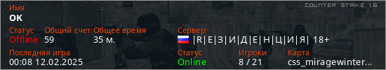Последний раз был в сети 00:08 12.02.2025 Игрок с таким ником замечен на 35 серверах