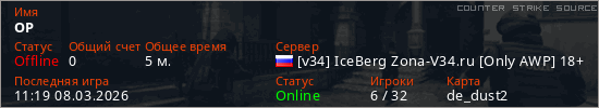 Играет на Counter Strike Source сервере. Страна: РоссияПервый раз замечен 11:11 08.03.2026