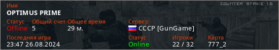 Играет на Counter Strike 1.6 сервере. Страна: РоссияПервый раз замечен 12:13 15.05.2023