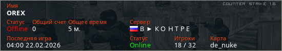 Играет на Counter Strike 1.6 сервере. Страна: РоссияПервый раз замечен 03:39 22.02.2026