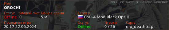 Играет на Call of Duty 4: Modern Warfare сервере. Страна: РоссияПервый раз замечен 20:15 22.05.2024