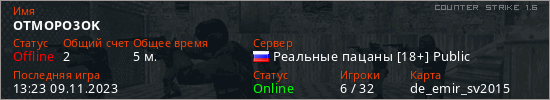 Играет на Counter Strike 1.6 сервере. Страна: РоссияПервый раз замечен 13:19 09.11.2023