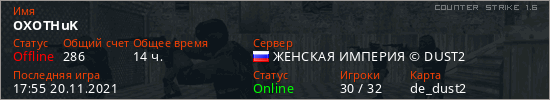 Играет на Counter Strike 1.6 сервере. Страна: РоссияПервый раз замечен 11:34 06.11.2021