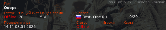 Играет на Call of Duty 4: Modern Warfare сервере. Страна: РоссияПервый раз замечен 14:01 03.01.2026