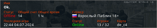 Играет на Counter Strike 1.6 сервере. Страна: РоссияПервый раз замечен 23:44 29.09.2020