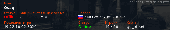 Играет на Counter Strike Source сервере. Страна: РоссияПервый раз замечен 19:20 10.02.2026