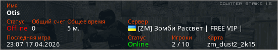 Играет на Counter Strike 1.6 сервере. Страна: УкраинаПервый раз замечен 23:05 17.04.2026