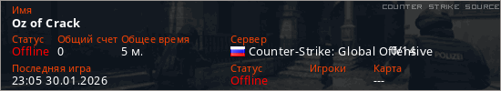 Играет на Counter Strike Source сервере. Страна: РоссияПервый раз замечен 23:03 30.01.2026