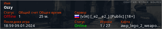 Играет на Counter Strike Source сервере. Страна: РоссияПервый раз замечен 18:18 10.11.2023