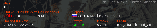 Играет на Call of Duty 4: Modern Warfare сервере. Страна: РоссияПервый раз замечен 21:10 02.02.2025