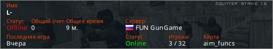 Играет на Counter Strike 1.6 сервере. Страна: РоссияПервый раз замечен 05:22 04.09.2025