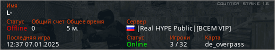 Играет на Counter Strike 1.6 сервере. Страна: РоссияПервый раз замечен 12:30 07.01.2025