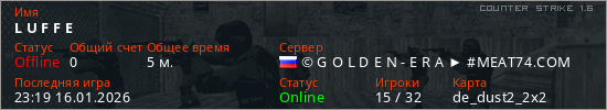 Играет на Counter Strike 1.6 сервере. Страна: РоссияПервый раз замечен 23:17 16.01.2026