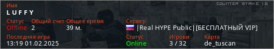 Играет на Counter Strike 1.6 сервере. Страна: РоссияПервый раз замечен 20:08 21.01.2025