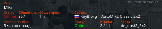 Играет на Counter Strike 1.6 сервере. Страна: РоссияПервый раз замечен 19:28 07.03.2026
