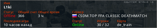 Играет на Counter Strike 1.6 сервере. Страна: РоссияПервый раз замечен 17:24 07.03.2026