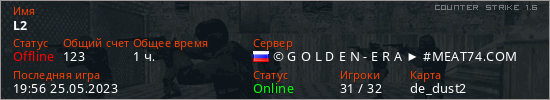 Играет на Counter Strike 1.6 сервере. Страна: РоссияПервый раз замечен 15:25 25.05.2023