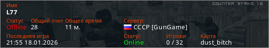 Играет на Counter Strike 1.6 сервере. Страна: РоссияПервый раз замечен 21:39 18.01.2026