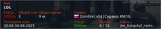 Играет на Counter Strike Source сервере. Страна: РоссияПервый раз замечен 19:15 30.08.2025